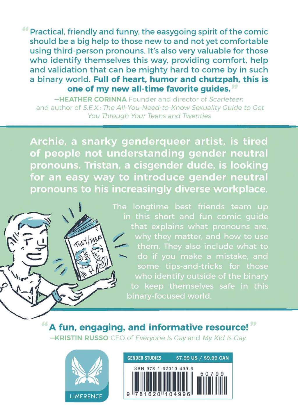 Archie, a snarky genderqueer artist, is tired of people not understanding gender neutral pronouns. Tristan, a cisgender dude, is looking for an easy way to introduce gender neutral pronouns to his increasingly diverse workplace. The longtime best friends team up in this short and fun comic guide that explains what pronouns are, why they matter, and how to use them. They also include what to do if you make a mistake, and some tips-and-tricks for those who identify outside of the binary to keep themselves safe in this binary-centric world.