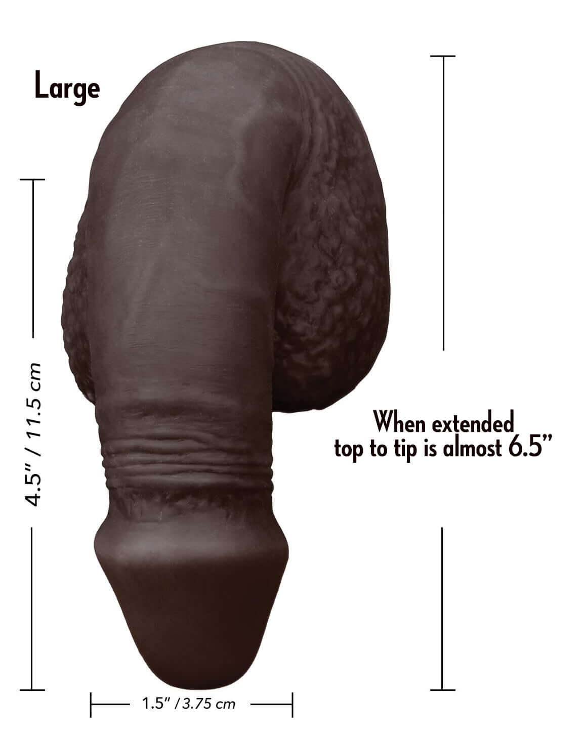 • Large total length: 6.5”, Shaft Length: 4.5” (measured from the underside), Width: about 1.5” at the base of the shaft, 2" across the testicles.